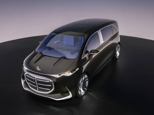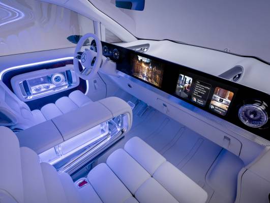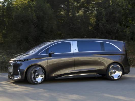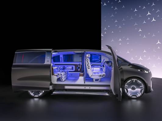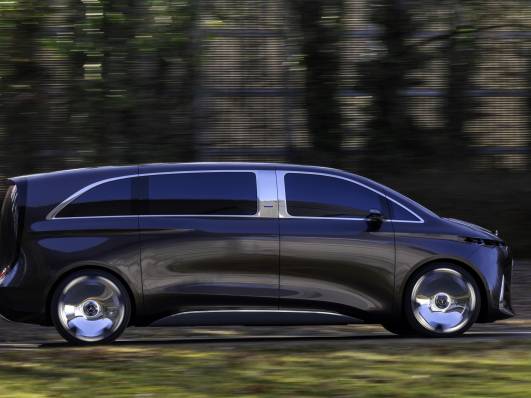 Die Studie Mercedes-Benz Vision V basiert auf einer neuen, elektrischen Van-Architektur und soll „ultimativen Komfort“ bieten. Unter anderem gehören ein ausfahrbarer 65-Zoll-Bildschirm, ein Surround-Soundsystem mit 42 Lautsprechern sowie sieben Projektoren und ein raffiniertes Lichtkonzept zur Ausstattung.