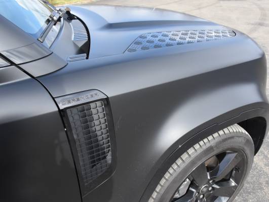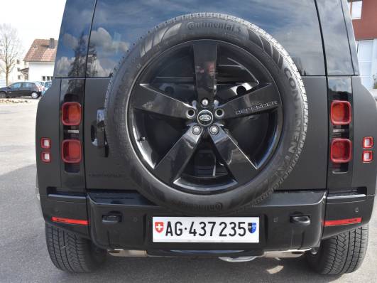 Aussen nimmt der Neue traditionelle Designmerkmale auf. Geblieben sind die eckige Grundform und das kantige Heck des Ur-Defenders. Vorne wurden Stilelemente in die Neuzeit übertragen, wie etwa die schmalen LED-Matrix-Scheinwerfer oder der glatte Kühlergrill. Der Aerodynamik geschuldet ist die vergleichsweise flache Frontscheibe. Geblieben sind auch das optional erhältliche Reserverad und die seitlich angeschlagene, sich weit öffnende Hecktüre.