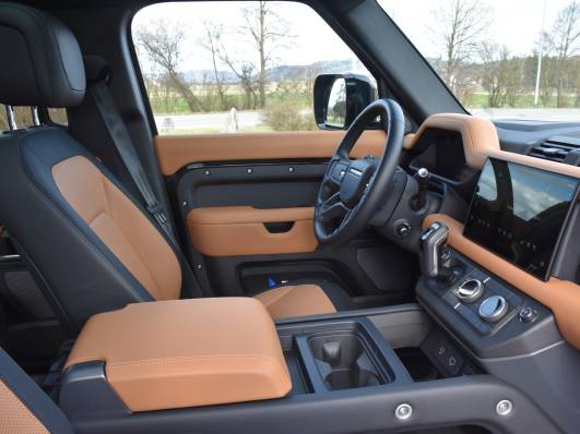 Unser Testfahrzeug war mit dem Dreiliter-Sechszylinder-Turbobenziner P400 mit 294 kW (400 PS) motorisiert. In Kombination mit der 8-Gang-Automatik lässt sich der Defender 110 jederzeit souverän bewegen. Bei Bedarf auch sportlich, schafft er doch den Spurt aus dem Stand auf 100 km/h trotz eines Leergewichts von gut 2,4 Tonnen in 6,1 Sekunden.