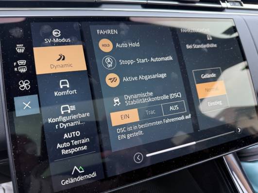 Auf der Strasse fällt bei der SV-Version die Kombination aus komfortabler Federung, leisem Innenraum und direkter Lenkung auf. Die adaptive Dämpfung passt das Fahrwerk dynamisch dem Strassenzustand und Fahrmodus an. Im Alltagstempo ermöglicht es eine ruhige, komfortable Fahrt; im Sport-Modus wechselt der grosse SUV zwar seinen Charakter, bleibt aber in jeder Situation gut beherrschbar. Dazu trägt auch die präzise Lenkung bei.