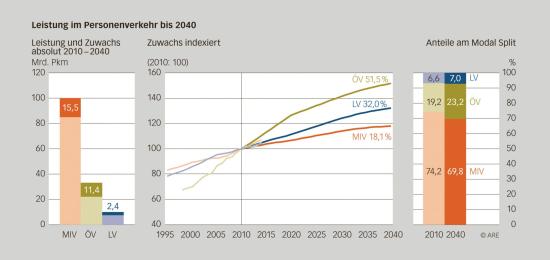 So ist errechnet worden, dass der öffentliche Verkehr bis 2040 einen Zuwachs von 51 % gegenüber heute verzeichnen wird. Beim Langsamverkehr (LV) sind es 32 %, beim motorisierten Individualverkehr MIV sollen es nur gerade 18% sein. In der Studie wird dieser Umstand so erklärt, dass die Entwicklung des MIV weniger dynamisch sein werde als bisher und dass es Sättigungstendenzen im Motorisierungsgrad sowie eine Verlagerung hin zum ÖV und zum LV gäbe. Aber auch beim Güterverkehr geht die Studie davon aus, dass der Zuwachs mehr in Richtung Schiene gehen wird. Gemäss den Berechnungen soll das Wachstum auf der Schiene (45%) um rund einen Drittel höher sein als auf der Strasse (33 %).