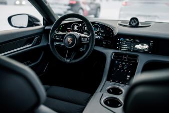 Fahrer und Beifahrer sind im Taycan durch eine breite Mittelkonsole getrennt. Dort befinden sich weder Schalter noch Knöpfe, sondern ein weiterer 8,4 Zoll grosser Touchscreen. Er übernimmt die Steuerung von Fahrzeugfunktionen wie etwa die Klimaautomatik und arbeitet mit haptischer Rückmeldung. Eine integrierte Handschriftenerkennung ermöglicht zudem die schnelle Eingabe von Navigationsadressen oder Telefonnummern. Über dem Monitor befindet sich das Infotainmentsystem im 10,8 Zoll-Format, das zur Bedienung von Navigation und Entertainment dient.