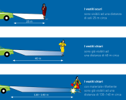 Guidando all’imbrunire o di notte, la capacità visiva si riduce al 5%) del valore diurno. Gli ostacoli, e i pedoni, vengono percepiti molto più tardi. Se inoltre piove, nevica o c’è nebbia, la vista peggiora ulteriormente. In questi casi bisogna guidare più lentamente e mantenere una distanza maggiore dagli altri veicoli. Se il conducente ha difficoltà a percepire le differenze di luminosità al buio, parliamo di emeralopia o cecità notturna. Se l’ottico non è più in grado di porvi rimedio, occorre per quanto possibile evitare di guidare di notte.